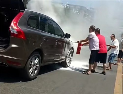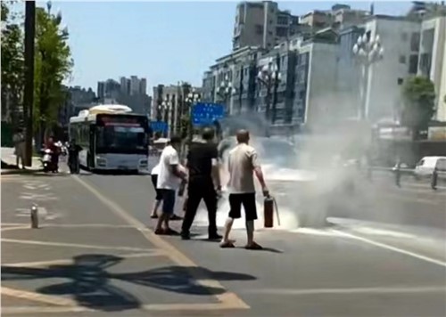 停車后,余善全拿起車內(nèi)滅火器便向發(fā)生燃燒的汽車沖去。此時(shí),燃燒車輛駕駛員正站在路邊打電話求救。當(dāng)余善全進(jìn)行滅火時(shí),另一位公交車駕駛員任俊全也拿著滅火器參與滅火。與此同時(shí),附近店鋪內(nèi)沖出兩名男子,手持滅火器加入滅火隊(duì)伍。很快,火勢(shì)被徹底撲滅。